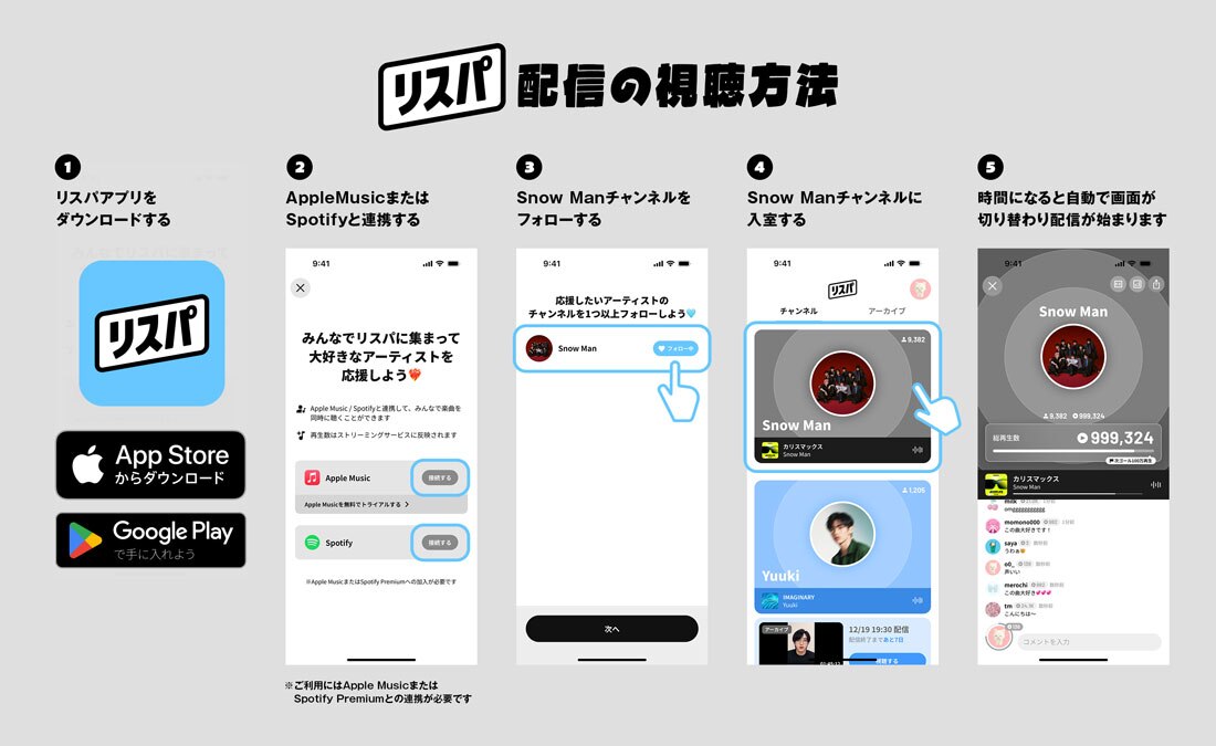 メンバーと一緒に音楽を聞いて聴いて盛り上がれるアプリ「リスパ」にてSnow Manチャンネルが開設!